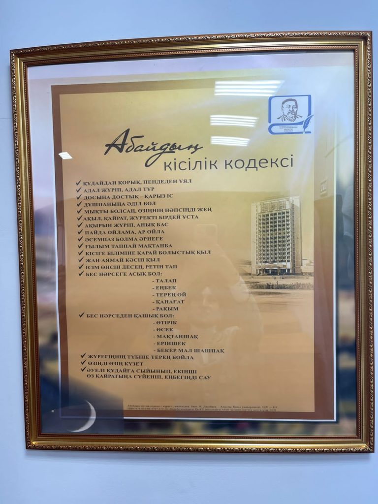 Осы жерде сұрақ туындайды, неге біз де «Абайдың кісілік кодексін» ілмеске? Өкінішке орай, аталмыш университетте ғана ілінген. Егер бұл кодекс барлық мекемелерден орын алса, нұр үстіне нұр болар еді. Себебі Абай Тұрақты дамудың 17 мақсатында айтылған мәселелердің көпшілігіне тоқталып өткен, алдын алуға шақырған.