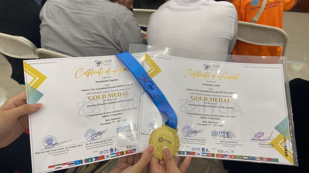 Оқушылардың қорғап жатқан жобасы Мырыш қаптамасының коррозияға тұрақтылығын арттыруға бағытталған. Жұмыстың мақсаты металл конструкциялар мен бұйымдарды коррозиядан қорғау үшін құрамында титан диоксиді бар композициялы мырыш жабынын алу. Қазіргі таңда металды коррозиядан қорғаудың негізгі әдісі – қорғаныс жабындарын жасау. Солардың ішінде мырышпен қаптау кеңінен таралған. Мырыш жабындарының қорғаныш қасиеттерін оның құрамына әртүрлі дисперсті бөлшектерді қосу арқылы жақсартуға болады. Осы мақсатта мырыш матрицасына дисперсті титан диоксидін енгізу арқылы коррозияға айтарлықтай төзімді жабындарды электрохимиялық жолмен алу қарастырылады.