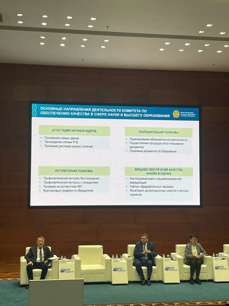 Жақында Астанада ҚР Ғылым және жоғары білім министрлігі Ғылым және жоғары білім саласындағы сапаны қамтамасыз ету комитетінің ұйымдастыруымен «Жоғары білім саласындағы сапаны қамтамасыз ету: жағдайы және даму перспективалары» атты форум өтті.